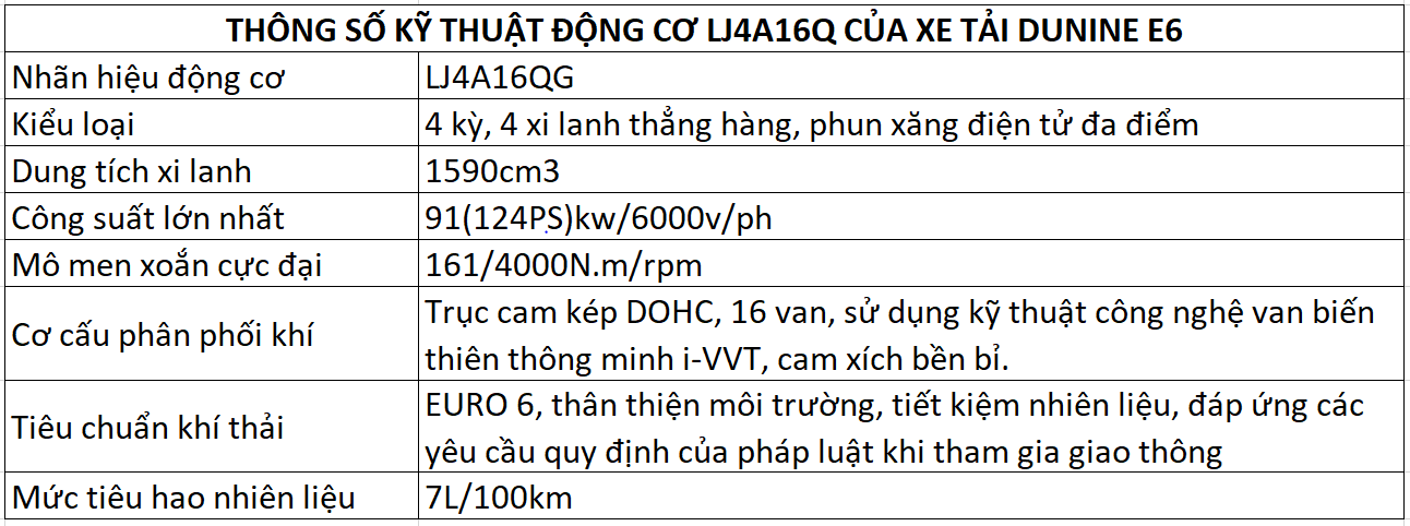 Xe tải Dunine E6 sử dụng nhãn hiệu động cơ LJ4A16QG, công nghệ GM (Mỹ). Đây là động cơ có đặc tính vòng tua máy thấp, mô men xoắn cao, thích hợp dùng cho cả các xe SUV, MPV, xe bán tải và xe tải nhẹ.